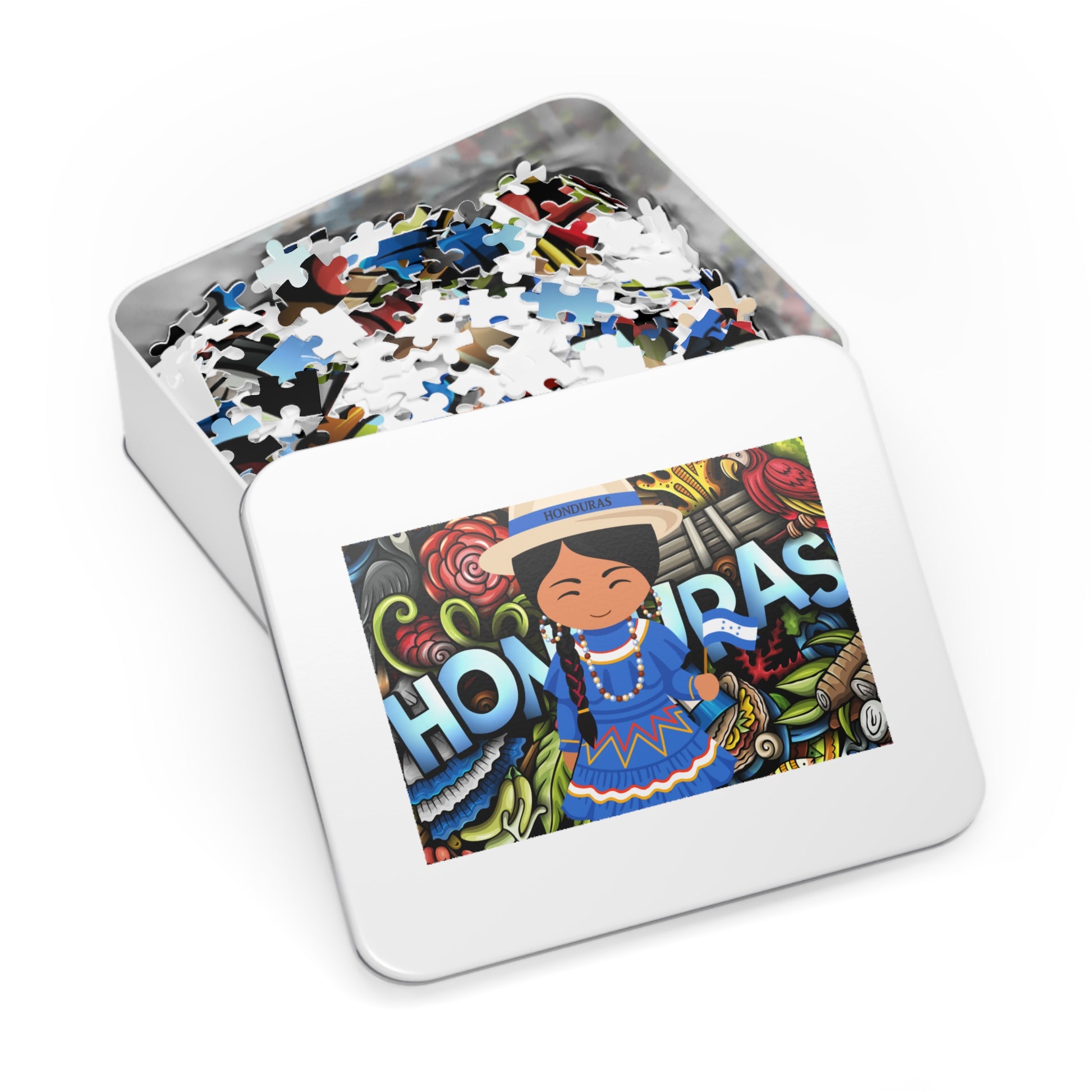 - White metal tin box with finished image on the cover